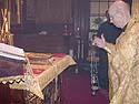 | Following the prothesis the priest (or deacon) incenses the altar, the icons, and the entire church. |
